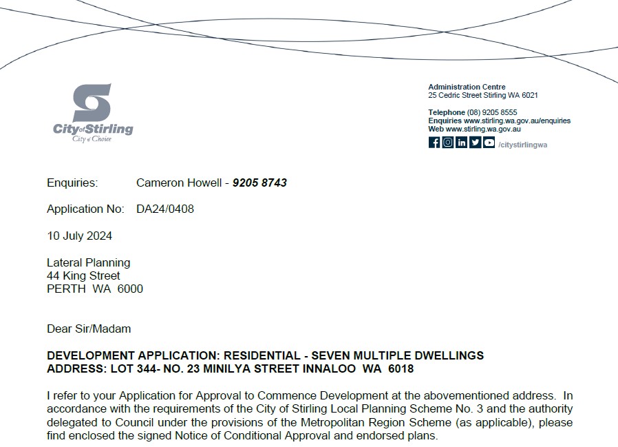 The 23 Minilya Project is an exciting residential development featuring a modern, low-rise build-to-rent apartment complex designed for sustainable living. It is a 2-storey apartment complex consisting of 7 units, with the look-and-feel of a townhouse complex. It is walking distance from the new City of Stirling CBD, which includes the Stirling train station and the Innaloo Shopping Centre. The site backs onto a large park and is within a 5km radius from Scarborough Beach and within a 10km radius from the Perth CBD.